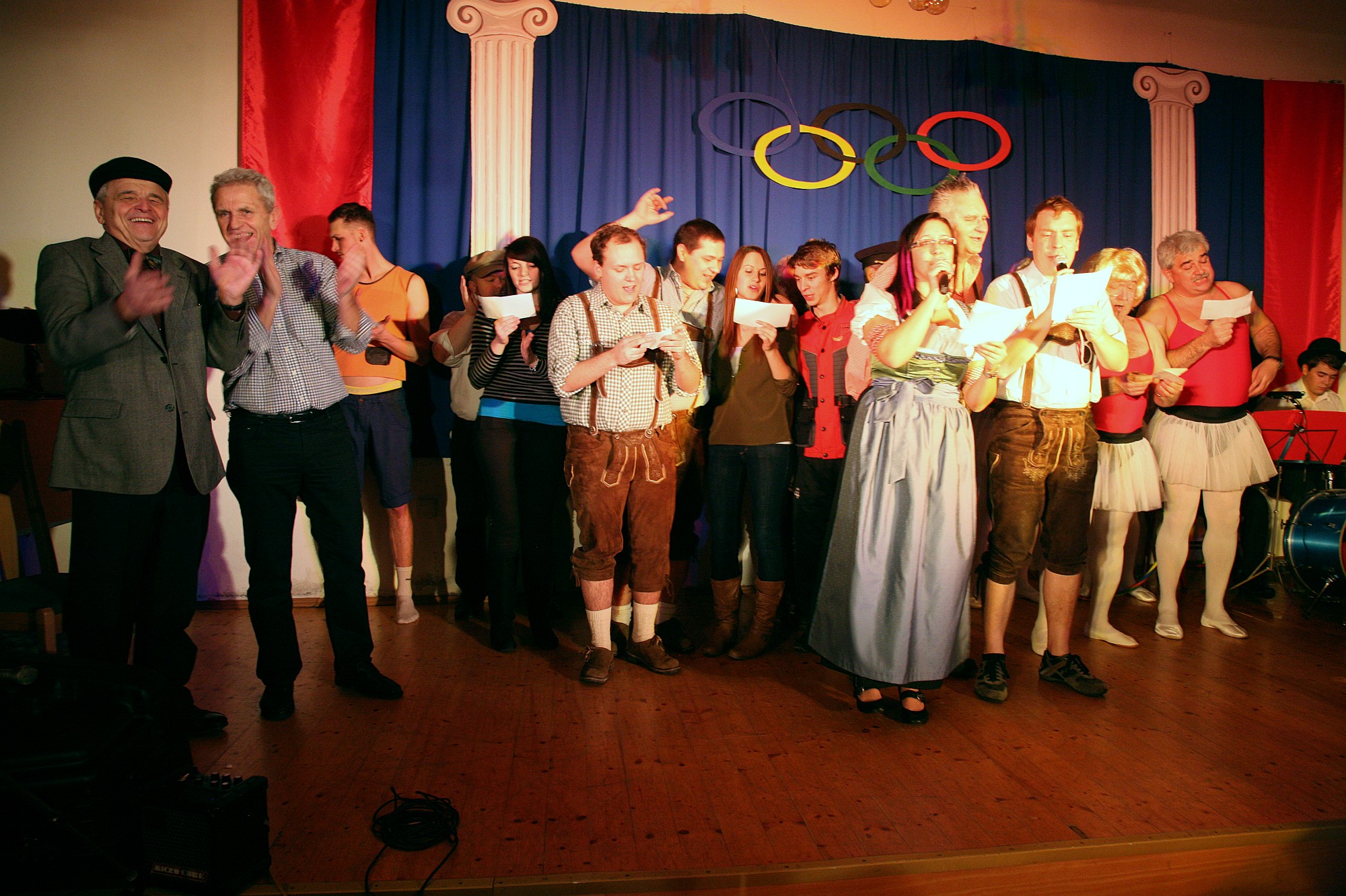 Gildenchef Max Erber und Peter Grundböck (links) freuen sich mit den Akteuren über die gelungene Premiere