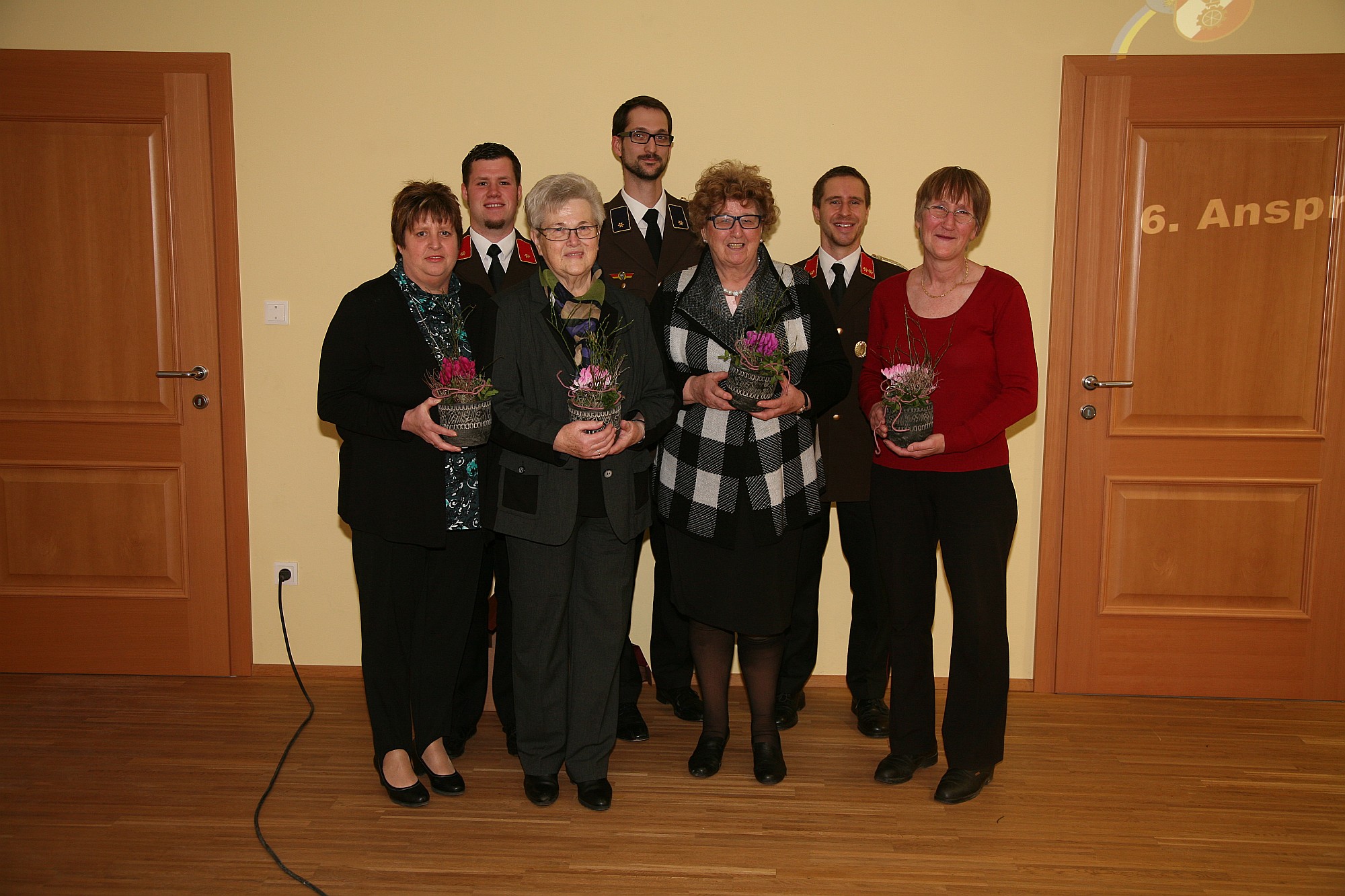 Mit Blumengrüßen bedankte sich Kdt. Christoph Eigner bei den Fahrzeugpatinnen, vorne von links: Rosi Poschmaier, Hedwig Amon, Waltraud Niederhametner und Christine Herzog, hinten von links: Kdt.Stv. Philipp Poschmaier, Leiter des Verwaltungsdienstes, Johannes Kickinger, Kdt. Christoph Eigner