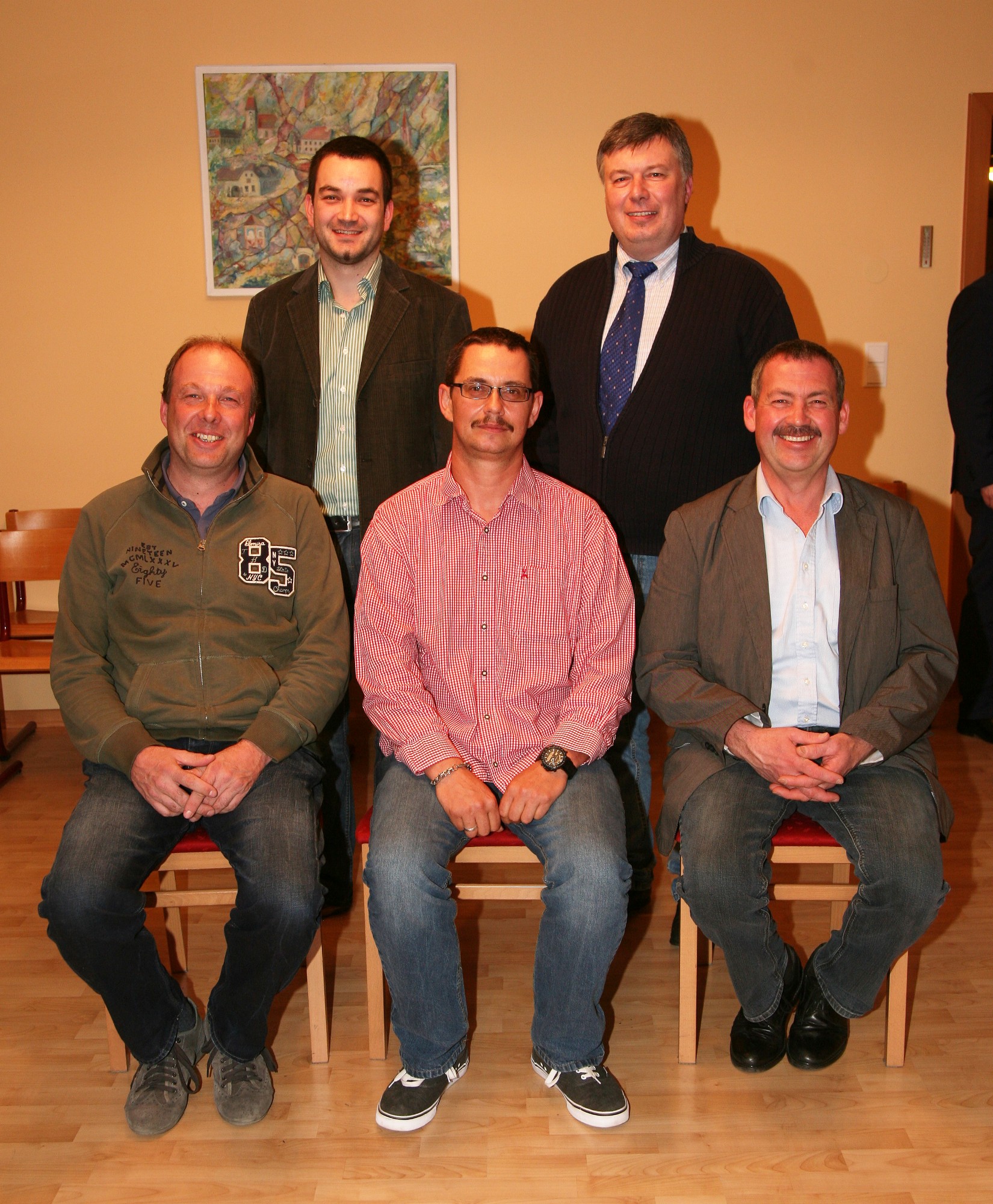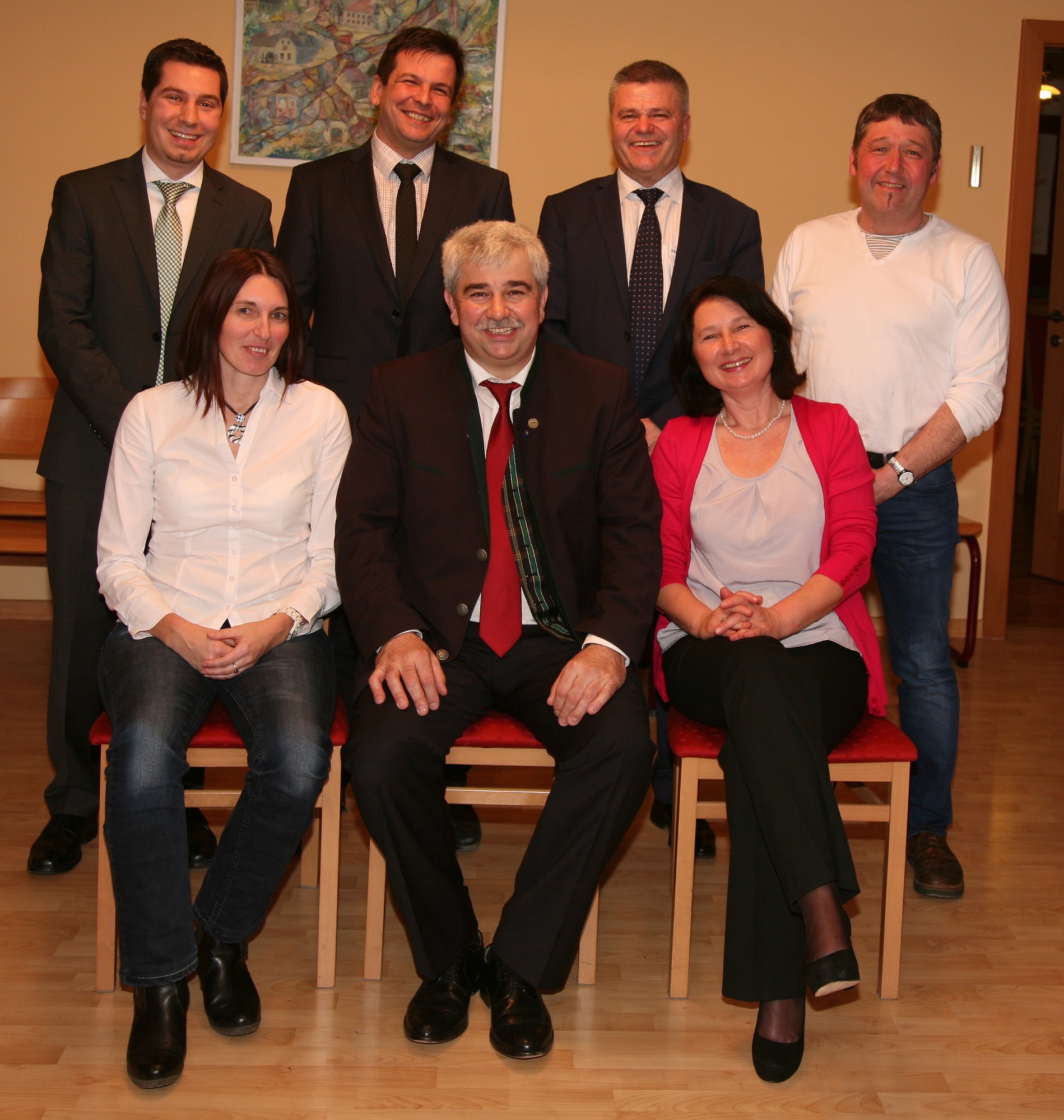 Gemeindevorstand: Vorne von links, sitzend: GGR Sylvia Diendorfer, Bgm. Reinhard Breitner, GGR Elfriede Figl, hinten von links: GGR Daniel Weiß, Vizebgm. Franz Erber, GGR Franz Peter Nussbaumer, GGR Alois Siedl