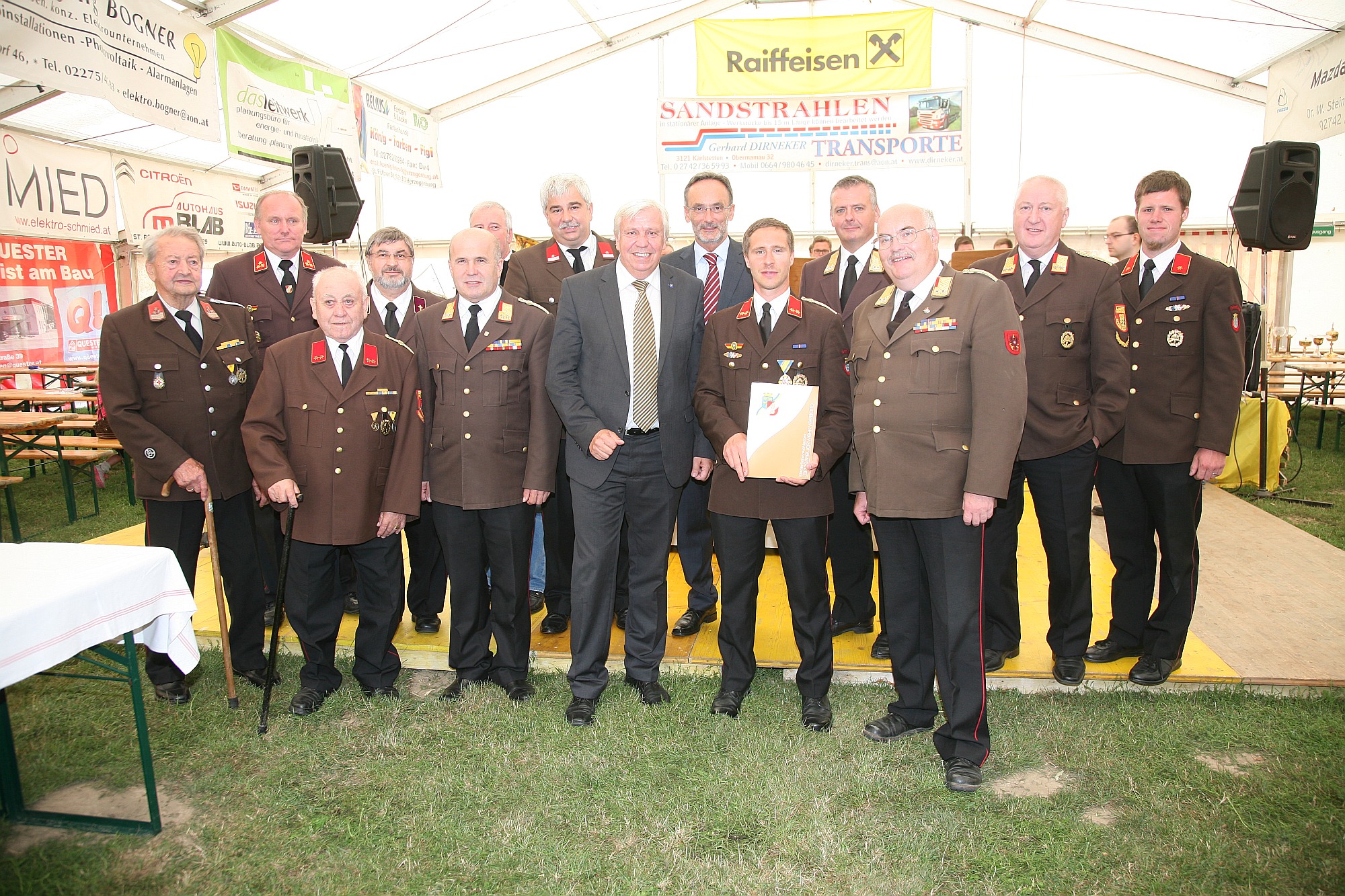 Gruppenfoto der Ehrengäste, von links: Alois Priesching, EKdt. Franz Buchinger, Leopold Schweyer, Pfarrer Johannes Schörgmayer, BR AKdt. Helmut Czech, Bgm. Reinhard Breitner, 2. Präs. des NÖ Landtages Mag. Johann Heuras, BH Mag. Josef Kronister, Kdt. Christoph Eigner, Landesfwkdt. Dietmer Fahrafellner, Bundesfwkdt. Ignaz Mascha, Johann Bauer und Kdtstv. Philipp Poschmaier.