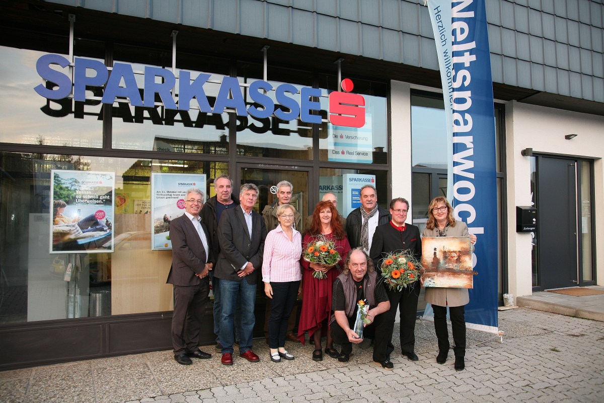 hzg_44_kuenstlergespraech_2 29. Oktober 2016 von peternuss ← Vorheriges Bild Nächstes Bild → Von links: Hans Engelhart, Josef Dürauer, Johann Huber, Johann Pickl, Elfriede Schaberger, Christine Huber, Erich Golembiowski, Frajo Lassé, Herbert Munk, Hans Baumgartner und Renate Munk vor der Sparkassenfiliale Perschling