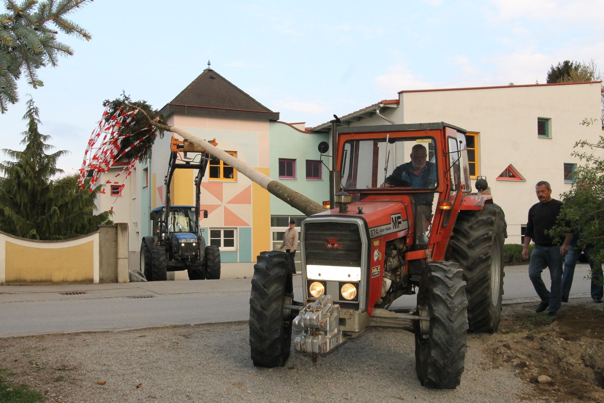 hzg_18_ogp_maibaum_aufstellen_perschling 30. April 2017 von peternuss Nächstes Bild → Das erfahrene „Maibaumteam“ Anton Eigner und Leopold Herzog transportieren den Maibaum mit ihren Traktoren und setzten ihn in das vorbereitete Loch gegenüber dem Kindergarten.