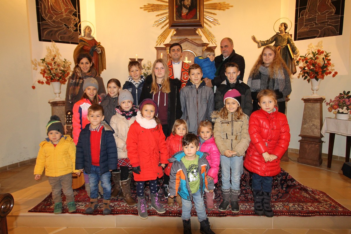 Die Dorfjugend gestaltete die Abendmesse: Vorne von links: Benedigt Schildberger, Eva Marschall, Mia und Emilia Erber, Alexander Bandel, Livia Erber, Lilith Würschinger, Marie-Christin Bandl; 2. Reihe von links: Cornelia Schlaffer, Lena Buchinger, Maximilian Marschall, Kahtarina Stöger, Thomas Marschall, Florian Buchinger, Sandra Öllerer; hinten von links: Magdalena Schildberger, Pfarrer Josef Balteanu und Obmann Heribert Scheikl mit Sohn Alexander