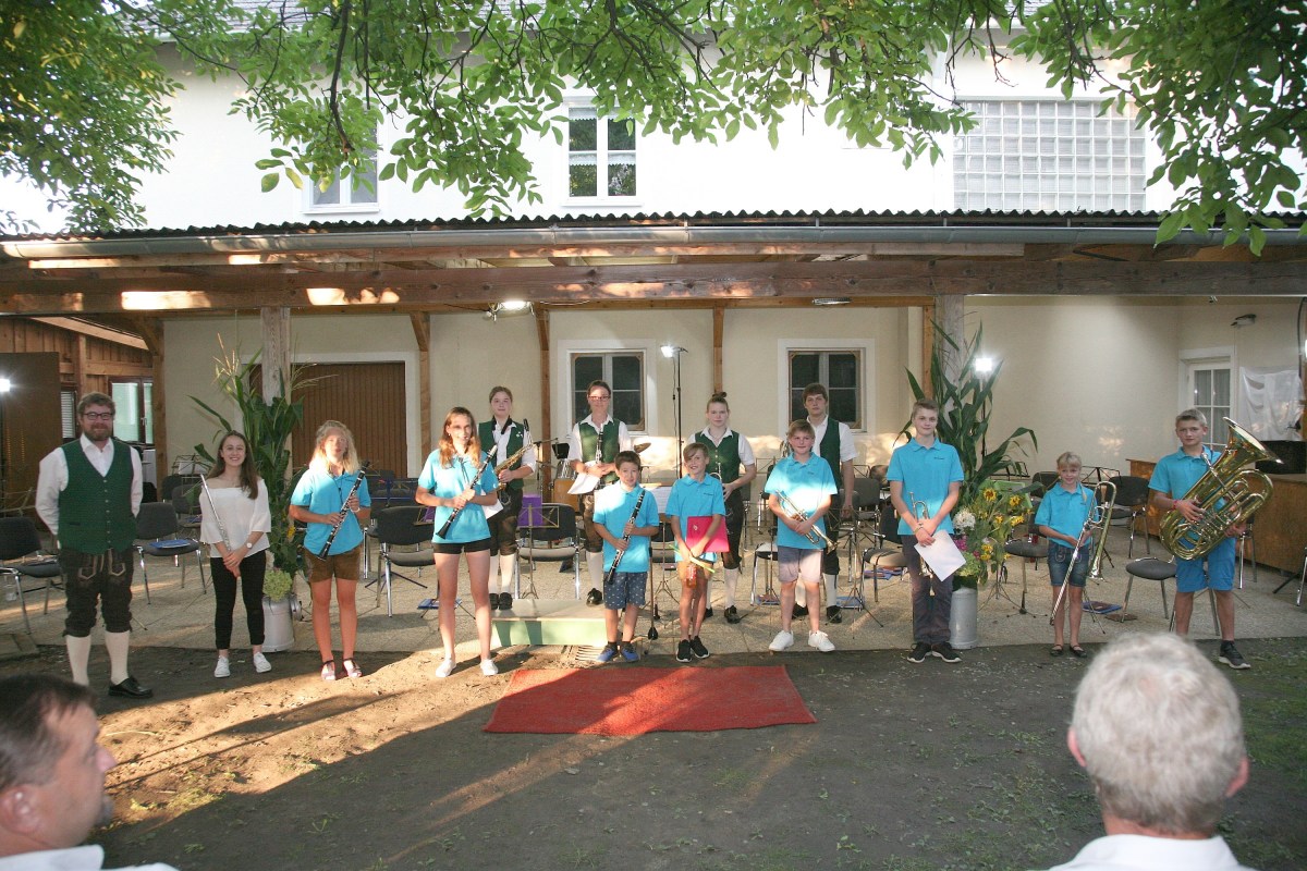Christian Trimmel (links) eröffnete mit der Juniorband das Konzert, vorne von links: Hanna Markgraf, Antonia Lambeck, Lorena Scheriau, Julian Edelbacher, Florian Berger, Elias Rödl, Samuel Vogl, Julia Berger, Franz Huber; hinten von links: Magdalena Vogl, Kathrin Berger, Lisa Buchinger und Gregor Wendl