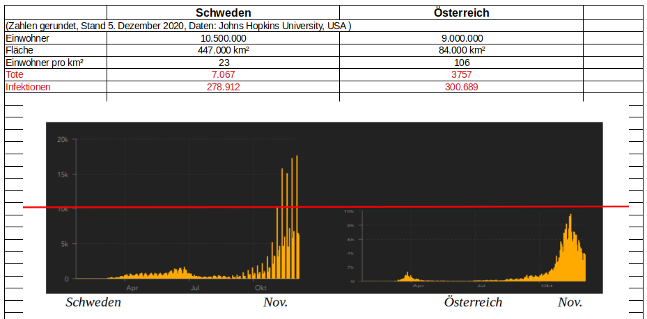 Schweden hat zwar bis jetzt insgesamt weniger Infektionen als Österreich, in Schweden gab es an manchen Tagen deutlich über 15.000 neue Infektionen, Schweden hat bis jetzt fast doppelt so viele Covid-19-Tote zu beklagen wie Österreich.