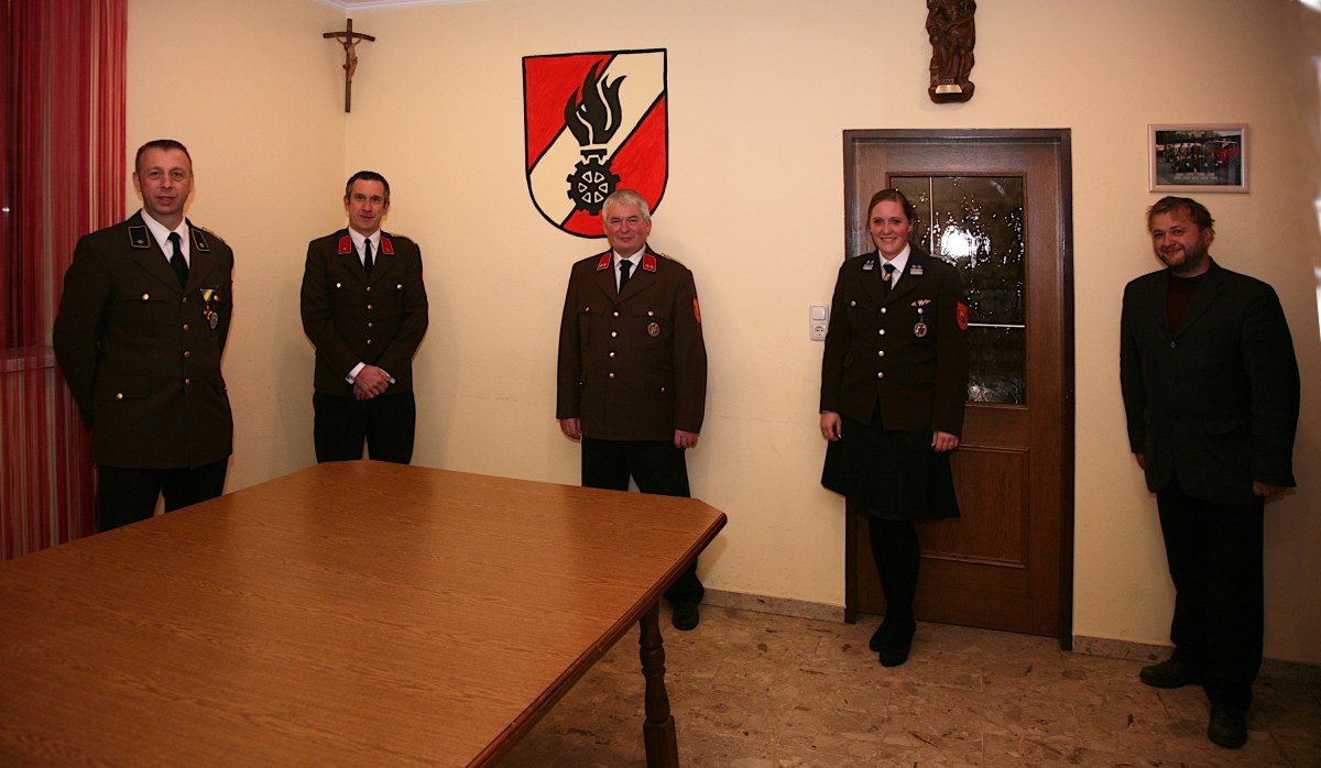 Bgm. Ing. Alois Vogl (rechts) leitete die Wahlen, bei denen das Kommando V Anton Nolz, Kdtstv. BI Martin Gräll, Kdt. OBI Willhelm Eigner und VM Andrea Tscherny (von links) bestätigt wurde.