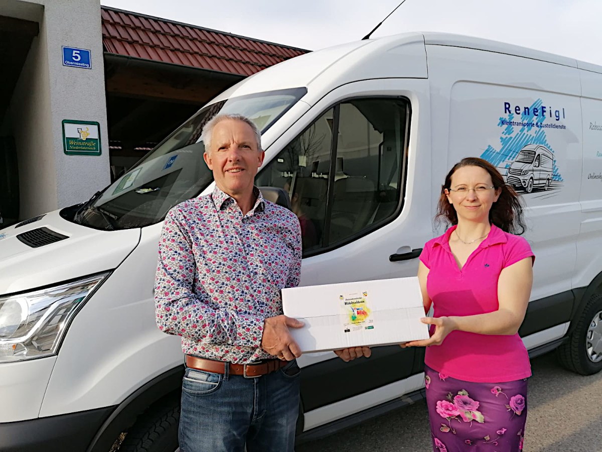 hzg_24_ruthmair_figl_gattinger 2. April 2021 von peternuss Nächstes Bild → Heurigenwirt Alfred Ruthmair und Zustellerin Rebecca Figl-Gattinger freuen sich über das Lieferservice der Mittelpunktsweine.