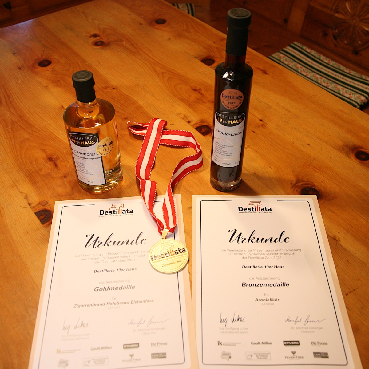 hzg_15_gruber_destillata 9. April 2021 von peternuss Nächstes Bild → Der „Zigarrenbrand“ erhielt bei der Destillata Gala 2021 eine Goldmedaille, der Aronialikör eine Bronzemedaille (von links)