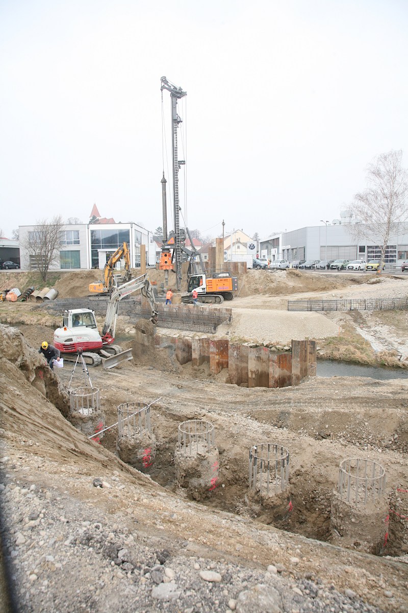 hzg_12_bruecke_kapelln 21. März 2022 von peternuss Nächstes Bild → Im Hintergrund sieht man die Maschine, die die Löcher für die Fundamente bohrte, im Vordergrund wurden die fünf mit Beton verfüllten und mit Eisen bewehrten Fundamente für die weitere Arbeit bereits freigelegt.