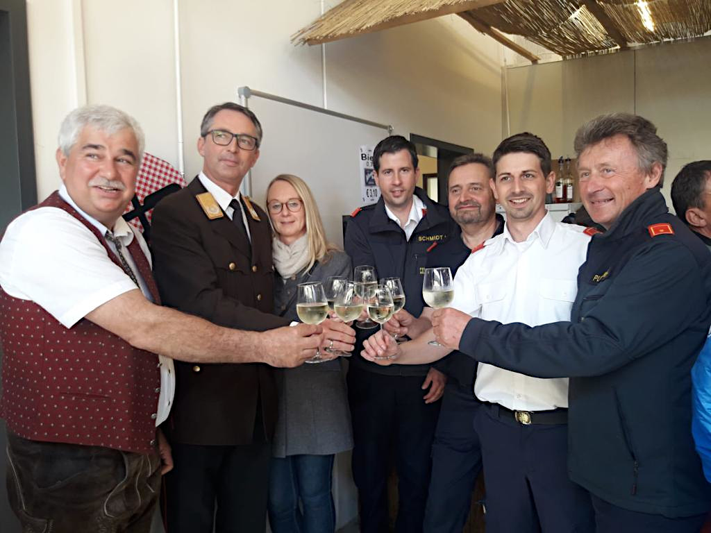 Bgm. Reinhard Breitner, Landesfeuerwehrkommandant-Stellverter Martin Boyer mit Gattin, Kdtstv. Matthias Schmidt, Ekdt. Johann Dorner, Kdt. Dominik Dorner, und EBI Anton Puxbaum (von links) stoßen auf das erfolgreiche Dreitagesfest der FF Murstetten an.