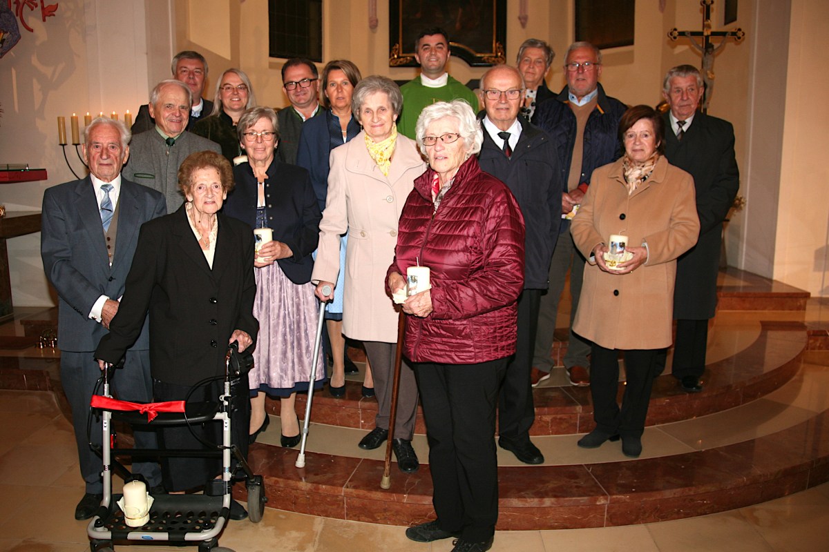 Pfarrer Josef Balteanu mit den Jubelpaaren der Pfarre, vorne von links: Josef und Margarethe Mayer (70) und Leopoldine Andrä (60), mittlere Reihe von links: Franz und Franziska Erber (50), Hildegard und Johann Stöger (55), Erna und Franz Kreizinger (60); hinten von links: Erich und Waltraud Golembiowski (25), Manfred und Silvia Weißmann (25), Pfarrer Josef Balteanu, Helga und Josef Nentwich (50).