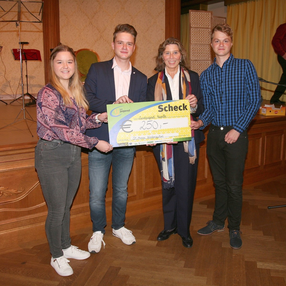 hzg_42_benefiz_st_anna_1 16. Oktober 2022 von peternuss ← Vorheriges Bild Nächstes Bild → Magdalena, Obmann Kilian und Samuel Vogl (von links) übergaben die Spende der Landjugend an Mag. Andrea Prantl (3. von links).