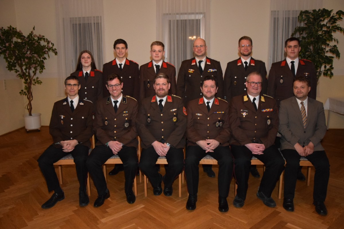 (von der FF Kap. zVg.): Das Kommando mit den Neuzugängen und Beförderten, vorne von links: Vstv. Johann Baumgartner, V Stefan Ratzinger, Kdt. Thomas Burger, Kdtstv. Dieter Schicklgruber, VR Romano Casoria, BGM Ing. Alois Vogl, hinten von links: Carina Burger, Lukas Schicklgruber, FM Lorenz Haas, HLM Peter Baumgartner, OLM Alexander Hirschböck und OFM Daniel Hruby